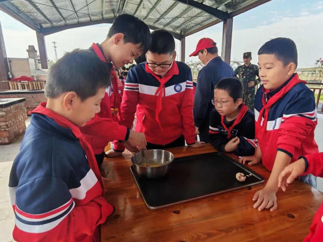 清晨八点半,黄州思源实验学校陈潭秋校区小学部的同学精神抖擞,整装出发。四(6)班学生率先奔赴盂钵桥村,投身“烽火战场—真人CS”沉浸体验,在模拟实战中感受红军战士的英勇与坚韧;与此同时,五(10)班学生则在范家岗村红色影厅观看革命题材影片,并在观影后亲手参与窑炉烘焙体验活动,揉面、塑形、烘烤,在劳动中体味农事之趣。