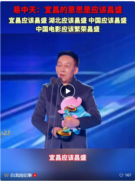 “宜昌,‘宜’意为应该,宜昌就是‘应该昌盛’,湖北应该昌盛,中国电影事业应该昌盛。”易中天对宜昌铿锵有力的解读,将这场长江文化艺术季闭幕式&2024-2025年度中国电影大数据暨电影频道M榜荣誉之夜的氛围推向了高潮。