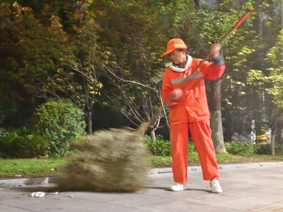 细致地清扫着落叶与杂物