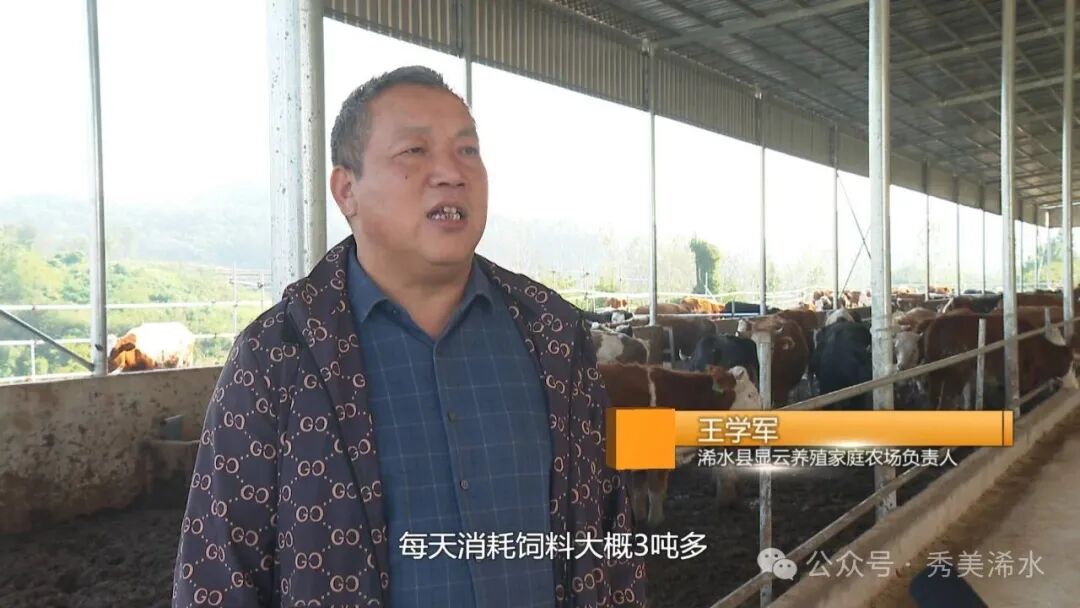 浠水县显云养殖家庭农场负责人 王学军:场地占地13000多平方米,我家有3个牛场,牛400多头,羊140多只,每天消耗饲料大概3吨多。