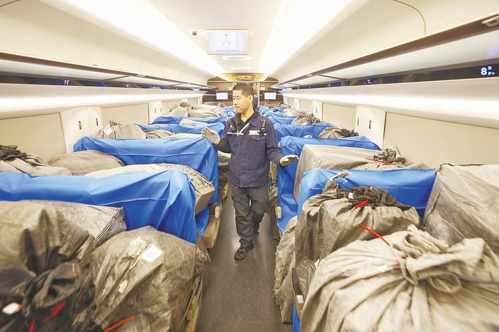 在首趟开出的“复兴号”货运专列上,车厢里的座椅均被隔膜保护,座椅上堆放着大大小小的灰色包裹。货物来自顺丰、京东等物流公司,每个包裹上车前均经过了安检。两列试点列车采用“点对点”直达模式,以350公里/时的速度在京广高铁上飞驰,全程1080公里,运输时长仅4.5小时,时效较公路运输提升八成。铁路部门介绍,此次试点列车成功开行后,将每周双向开行4对。