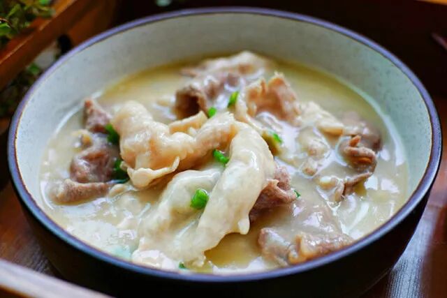 捶肉又叫杵肉、糊得肉,将切好的猪里脊混上红薯粉,以木槌反复捶打成薄片,纤维断裂而口感柔嫩鲜美,一碗喷香的肉汤立刻就能打开你的味蕾。