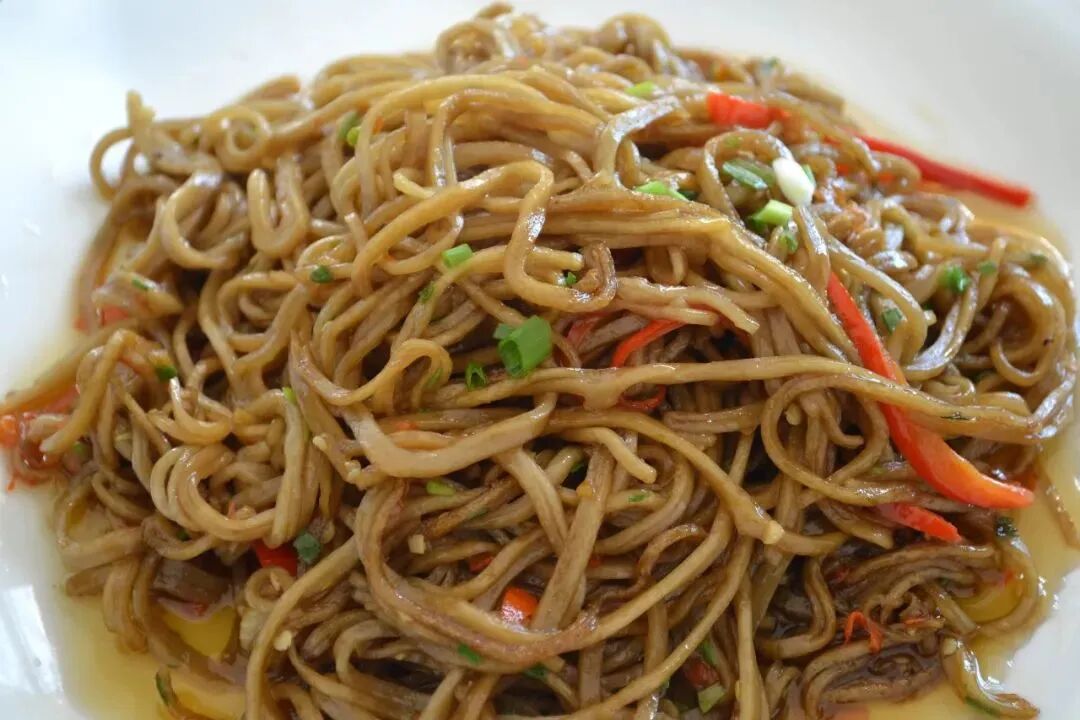 黄梅鱼面选用太白湖、龙感湖的鲜活青鱼或草鱼,取鱼背净肉剁茸,与优质红薯粉反复捶打糅合。鱼肉糜如雪,薯粉似玉,在老师傅的手中摔打成千丝万缕的“银丝”,晒干后韧而不硬,久煮不烂。老黄梅人说:“听戏要听《天仙配》,吃面要吃鱼打底。”鱼面里,藏着渔家的豪爽,还有戏班子赶场时的那口热乎气儿。