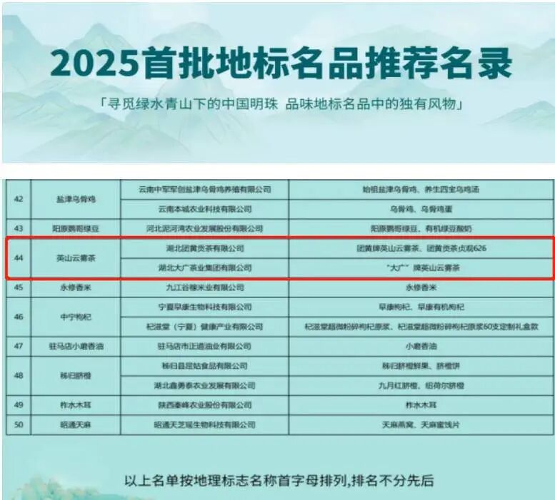英山云雾茶入选2025首批地标名品推荐名录50强