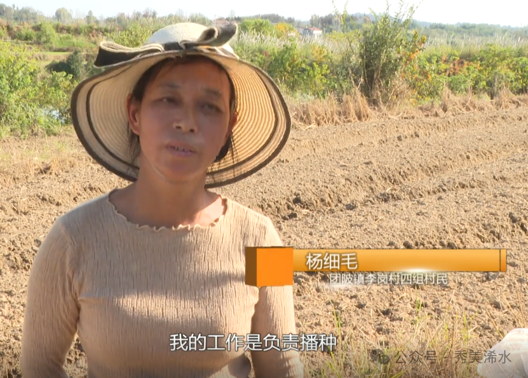 团陂镇李岗村四组村民 杨细毛:我的工作是负责播种,一天播种120斤,播种面积在一亩开外,每天8个小时,还可以照顾屋的。