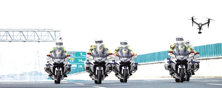 湖北省公安厅交通管理总队“无人机+智慧铁骑”快反队在高速公路上巡逻。
