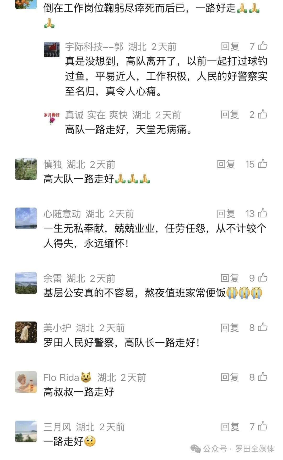 罗田县公安局交管大队民警 徐荣斌 高大队牺牲至今,我陆续接到了十几个群众关心询问高队长的电话,他们有的是十几年前高大队处理交通事故的群众,有的是近期的事故当事人及亲属,他们都对高大队的牺牲表示不敢相信和痛心。高大队严格公正的办案执法风格让很多事故当事人及亲属记忆深刻,而且他在执法的过程中的人性化,调解时的有耐心,赢得了很多群众的称赞。