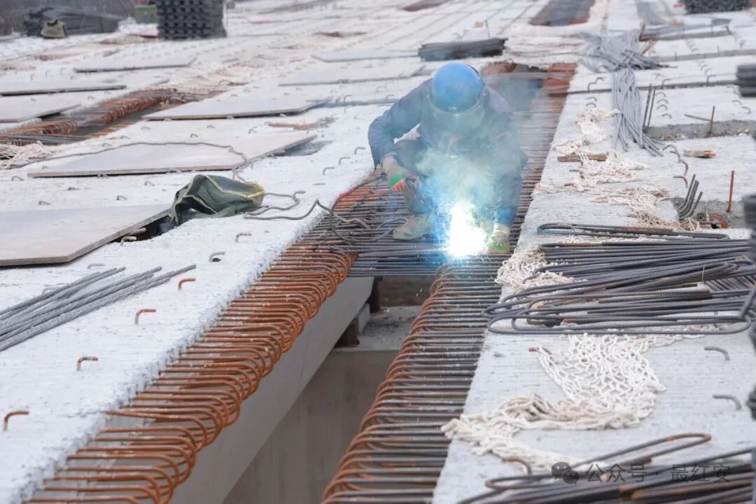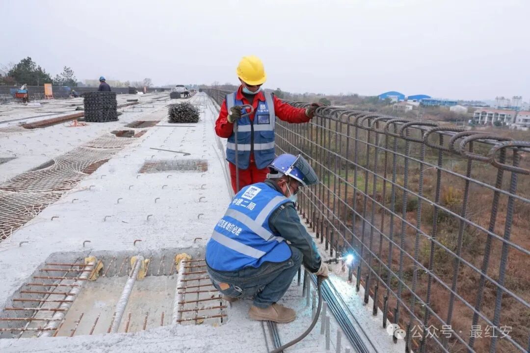 初冬的红安寒意渐浓,武汉都市圈环线黄陂至新洲段(红安段)项目现场却是一派火热,施工人员抢抓晴好天气加紧焊接作业,全力推进G230高架桥箱梁架设,各项工序高效有序。