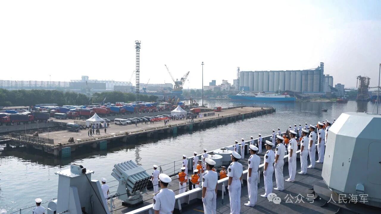 当地时间8时许,印尼方在丹戎不碌港举行欢送仪式,中国驻印尼大使馆工作人员、当地中资企业和华侨华人代表、印尼海军官兵代表来到码头送行。来自海军工程大学和海军航空大学的学员在甲板上分区列队,向送行队伍挥手道别。