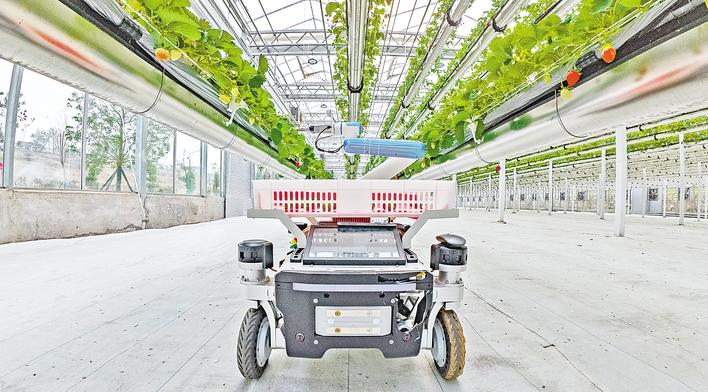 12月10日,当阳市绿沃川智慧农业产业园内,升降式栽培架上的草莓鲜红饱满。家长带孩子与草莓采摘机器人互动采摘,大棚内一派热闹景象,成为冬日“甜蜜”一景。今年新上线的3台采摘机器人搭载视觉识别系统,可自主定位成熟果实,通过柔性机械臂精准采摘,识别准确率超九成。“人机共摘”的新奇体验,吸引不少游客。