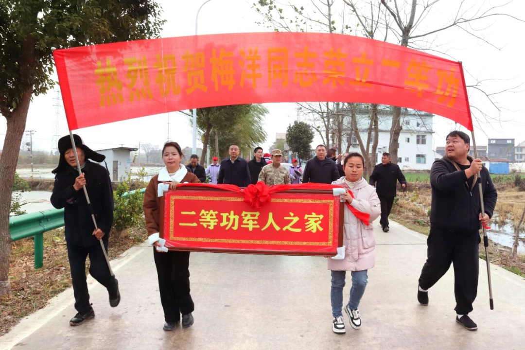 12月12日,黄梅县军地领导带队前往小池镇振兴村,为荣立二等功的现役军官梅洋家庭送上立功喜报、牌匾及奖励金。活动弘扬了“一人立功,全家光荣”的社会风尚,传递了对军人军属的尊崇与关怀。