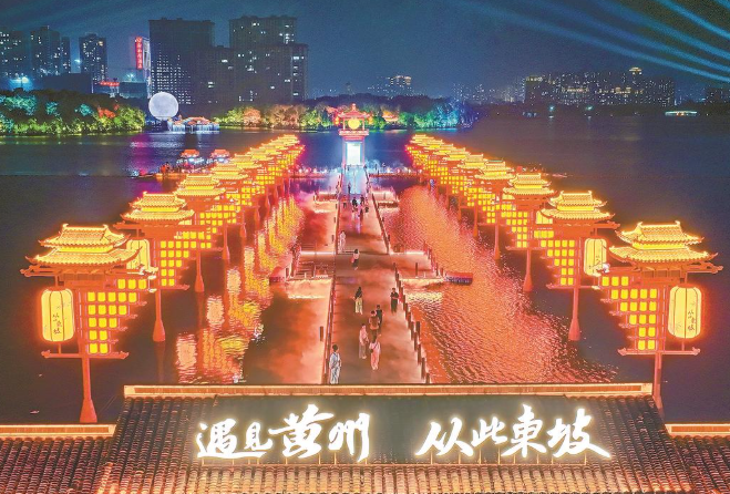 在产品打造上,黄冈锚定“文旅相融”主线,推出系列东坡主题特色产品:培育“东坡庙会”品牌,开展系列文化惠民活动1000余场次,单次线上流量最高达3000万人次,斩获中国文旅总评榜品牌奖,价值评估达4447.52万元;创新打造东坡庙会“三宝”(文化小剧、文创产品、特色美食),编创优秀文化小剧近100部、开发特色文创产品1000余种、评选来黄必点美食30道,积极推动“山货出山,消费进山”;原创实景音舞诗画《大江东去》以震撼的视听语言、深沉的文化表达,成为假期的“流量担当”;全国首个东坡文化沉浸式夜游项目“从此东坡”主题夜游,用最新的科技手段与最潮的叙事表达,让藏在典籍里的东坡文化“走出来”,变成游客可感、可玩、可带走的体验,荣获2025年文旅融合科技赋能产品全国创新范例;黄冈首家沉浸式宋文化主题餐秀东坡宴,将观众置身于诗词、舞蹈与光影交织的宋风情境中,见证苏东坡从朝堂名士到田间东坡的精神蜕变,让游客在“游黄州、忆东坡”中感受传统文化的当代魅力。