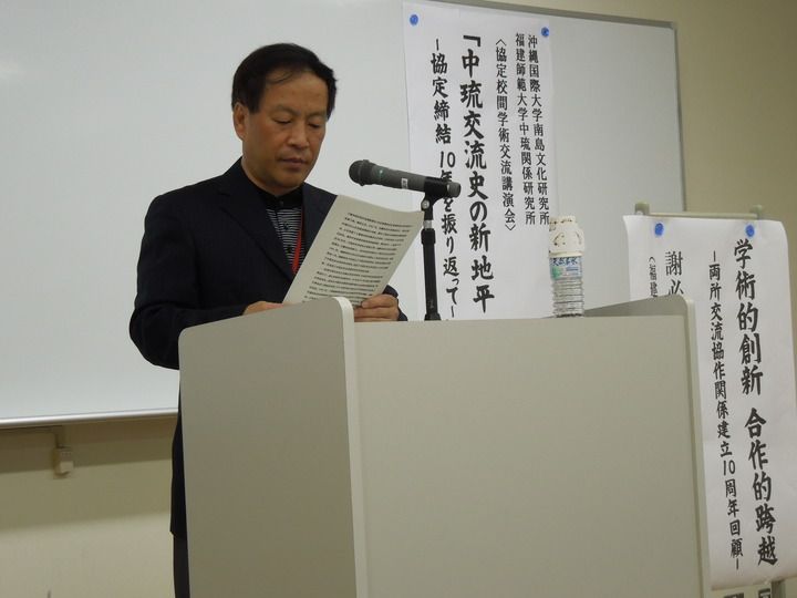 11月15日,福建师范大学中琉关系研究所创立三十周年暨“琉球学”学科建设学术研讨会上,中琉关系研究所所长谢必震介绍研究成果及与冲绳高校学术交流情况。(新华每日电讯记者邓倩倩 摄)