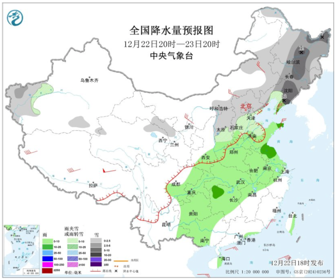 中央气象台预计,22日20时至23日20时,新疆南疆西部山区、内蒙古中东部、东北地区、青海北部、甘肃河西、陕西北部、华北中北部等地部分地区有小到中雪或雨夹雪,其中,黑龙江中南部、吉林中东部、辽宁东部和北部等地部分地区有大到暴雪。