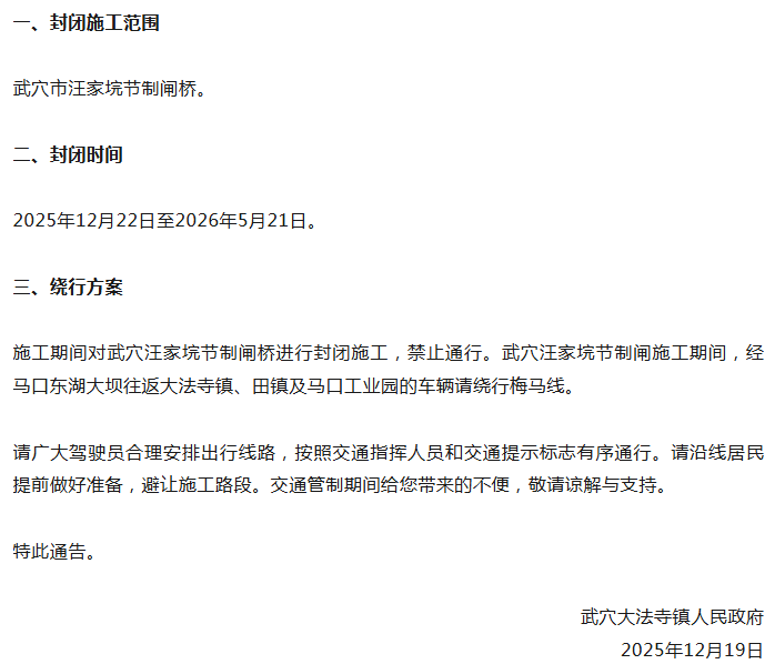 因武穴汪家垸节制闸拆除重建工程施工需求,为确保社会车辆及行人安全、施工安全、质量,决定对武穴汪家垸节制闸桥路段实施封闭施工。