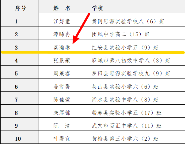 红安县实验小学五(9)班秦瀚琳同学入选