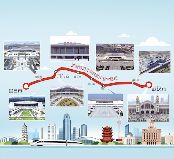 沪渝蓉沿江高铁武宜段起自汉口站,终点为宜昌北站。线路全长314公里,设计时速350公里,于2021年9月开工建设,共设汉口、汉川北、天门、京山南、钟祥南、荆门西、当阳西、宜昌北8座车站。其中,汉口站、荆门西站为既有车站,其余6座为新建车站。