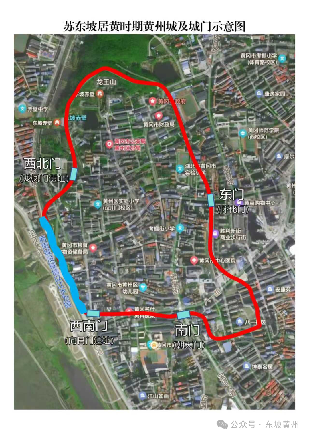 4.城西北的州衙。北宋初期黄州知州乐史在其所著的《太平寰宇记》中记载:黄州“中和五年移于旧邾城南,与武昌对岸。”接替乐史任黄州知州的王禹偁在《月波楼咏怀》诗中说:“齐安古郡废,移此清江头。筑城随山势,屈曲复环周。兹楼最轩豁,旷望西北陬。武昌地如掌,天末入双眸。平远无林木,一望同离娄。山形如八字,会合势相勾。”苏东坡《记赤壁》文章中说:“黄州守居之数百步为赤壁。”又在《念奴娇.赤壁怀古》词中说“古垒西边,人道是三国周郎赤壁。”张舜民在其《郴行录 》文章中记载:“(黄)州在大江之湄, 北附黄岗,地形高下。公府居民,极于萧条。知州厅事敝陋,大不胜处。国朝王禹偁尝谪此。”张耒在《明道杂志》文章中说:“黄州,江南流在州西,去治无百步,有山入江,石崖颇峻峙,土人言此赤壁矶也。”陆游在《入蜀记》文章中记载:“十八日。食时方行,晡时至黄州。州最僻陋少事,杜牧之所谓‘平生睡足处,云梦泽南州’。然自牧之、王元之出守,又东坡先生、张文潜谪居,遂为名邦。……见知州右朝奉郎直秘阁杨由义、通判右奉议郎陈绍复。州治陋甚,厅事仅可容数客。” 根据以上文章记载和实地考察分析,我们考证认定:苏东坡居黄州时期的黄州州衙,位于当今黄州区赤壁办汉川门社区原黄州区委老址上(北纬:30°452108 东经:114°863131 )的周边,其位置千年未变。