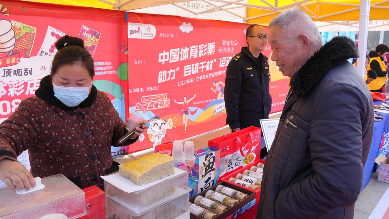 赛场周边,“体育+”融合服务同步开展:宣传展台前人头攒动,工作人员通过发放宣传册、现场答疑等方式,向群众提供法律咨询服务并普及国家医疗保障等相关惠民政策;热气腾腾的肉糕摊位香气四溢,志愿者们将切好的肉糕分发给参赛选手和围观群众。作为麻城市的传统美食,肉糕承载着“团团圆圆、家庭兴旺”的新年寓意 ,这份带着家乡味的暖心食物,让激烈的赛事多了几分烟火气与归属感。