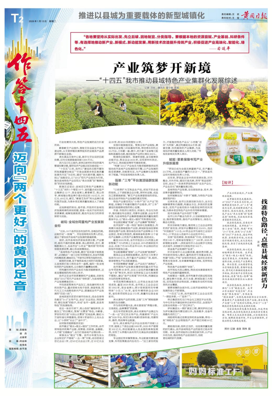 “十四五”以来,我市以“建设武汉都市圈协同发展重要功能区”“打造全国革命老区高质量发展先行区”为目标,锚定“依托都市圈、辐射大别山”战略定位,以“2312”现代产业体系为引领,推动县域特色产业实现从“单点突围”到“集群成势”的历史性跨越。