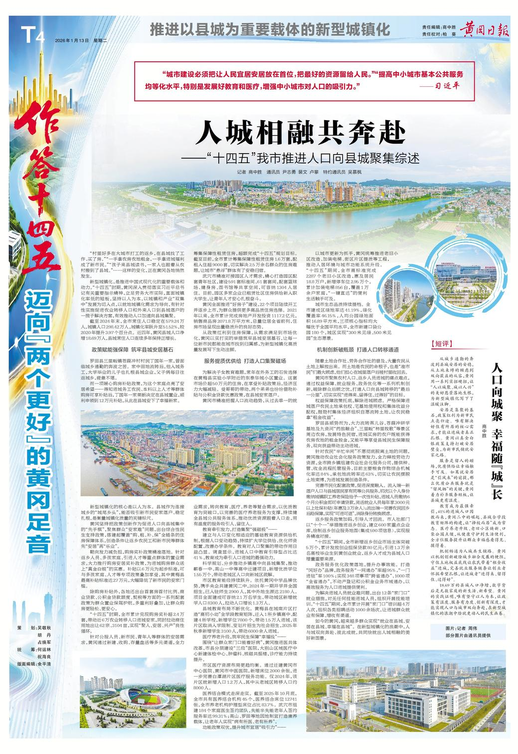 新型城镇化,是推进中国式现代化的重要载体和动力。“十四五”时期,黄冈深入贯彻落实习近平总书记有关重要指示精神,立足劳务大市实际,直面城镇化率低的短板,坚持以人为本,以城镇和产业“双集中”发展为切入点,以就地城镇化需求为导向,有针对性实施促进农业转移人口和外来人口到县城落户的一揽子解决方案,有效推动人口加速向县城集聚。