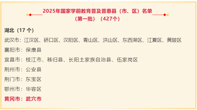 日前,教育部公布2025年学前教育普及普惠县(市、区)名单,武穴市成功入选,为黄冈市唯一上榜县市。