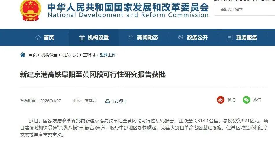 近日,国家发展改革委批复新建京港高铁阜阳至黄冈段可行性研究报告,正线全长318.1公里,总投资约521亿元。项目建设对加快贯通“八纵八横”京港(台)通道,服务中部地区加快崛起,完善大别山革命老区基础设施,促进区域经济和社会发展等具有重要意义。
