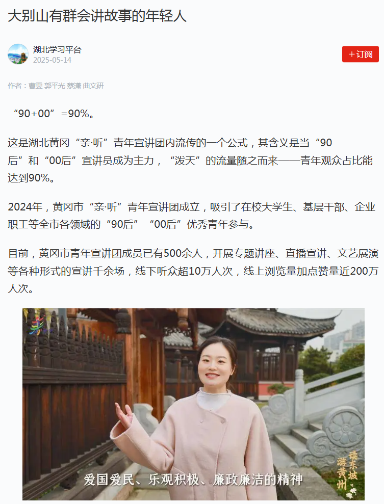 2025年5月14日,学习强国报道了黄冈市“亲·听”青年宣讲团,表示:好的宣讲,像土地上生长起来的一样。从生机勃勃的山谷中刮来的风,给人以亲近的感受。