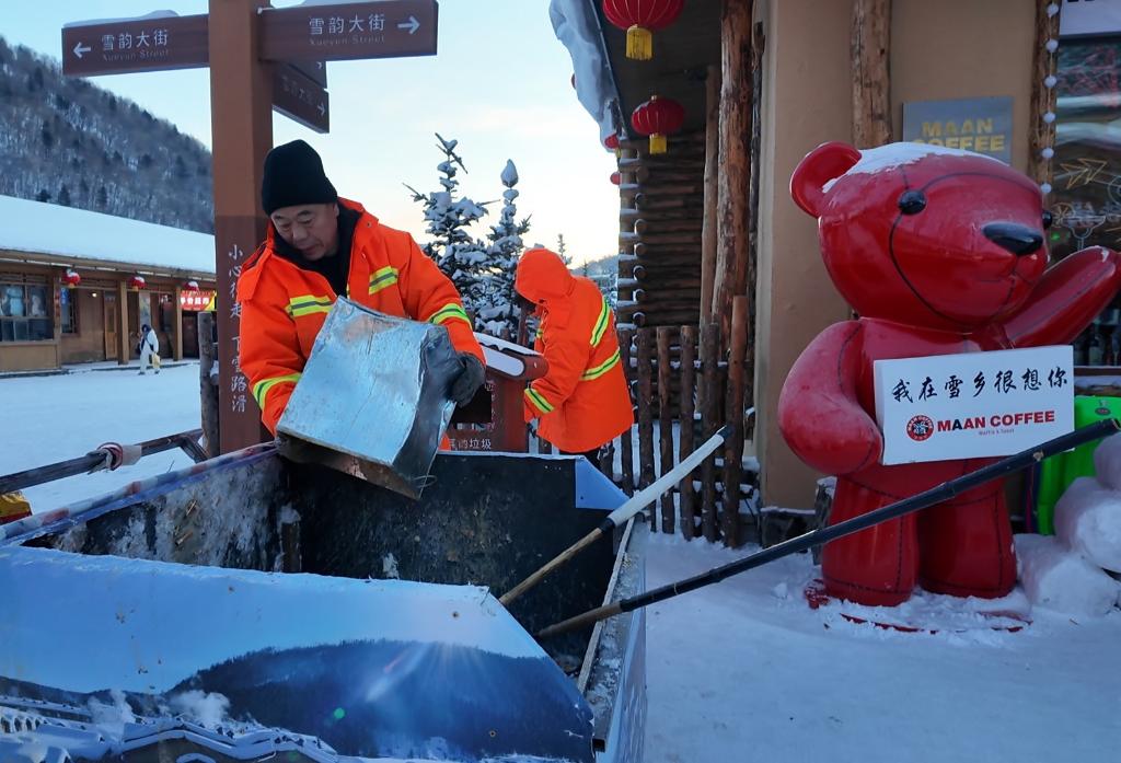 工作人员在“中国雪乡”景区清理垃圾。(受访者供图)