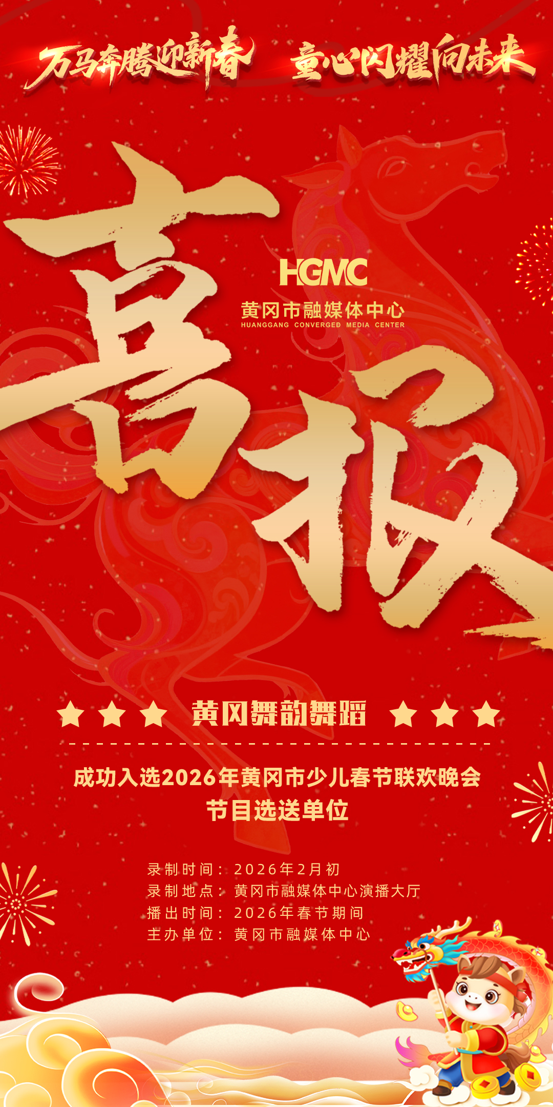 这个春节,让孩子站上属于自己的 C 位 ,“万马奔腾迎新春,童心闪耀向未来”——2026 年黄冈市少儿春节联欢晚会,等你闪耀!