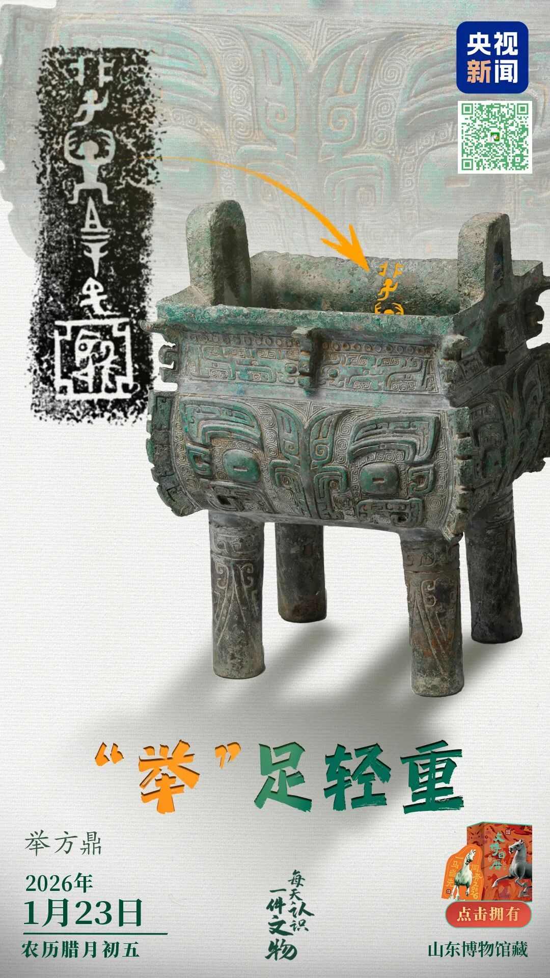 央视新闻联合全国博物馆推出文博科普产品《文博日历》,每天带你认识一件文物。商代举方鼎有一对立耳,“脖颈”处向内收束,腹部微鼓,造型略显“萌态”。腹部有经典的兽面纹、云雷纹,扉棱装饰增加了灵动之气,四根粗壮的柱足上还有蝉纹。整件方鼎铸工细致考究,造型厚重典雅,纹饰美观庄重。