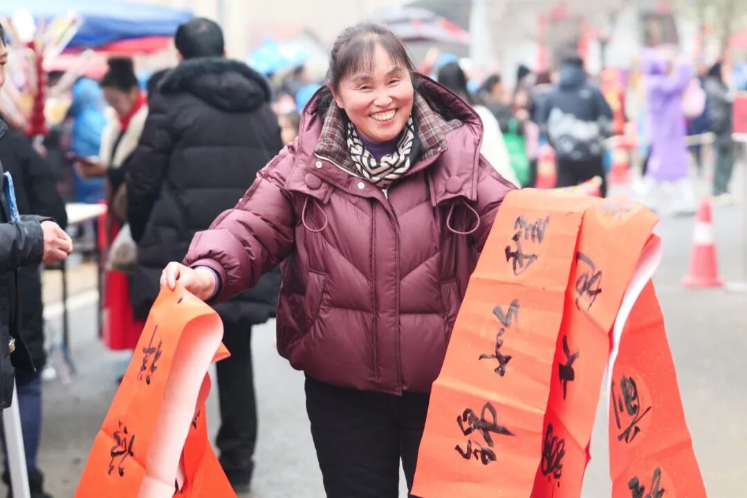活动现场年味浓郁、暖意融融。迎春集市上,黄州书画诗联协会书法家现场挥毫赠春联,红纸墨香传递传统年俗温情;特色糖画、风味腊货等摊位有序排布,“六进六送”便民服务与移风易俗趣味游戏穿插其中,让村民在逛购中尽享实惠。