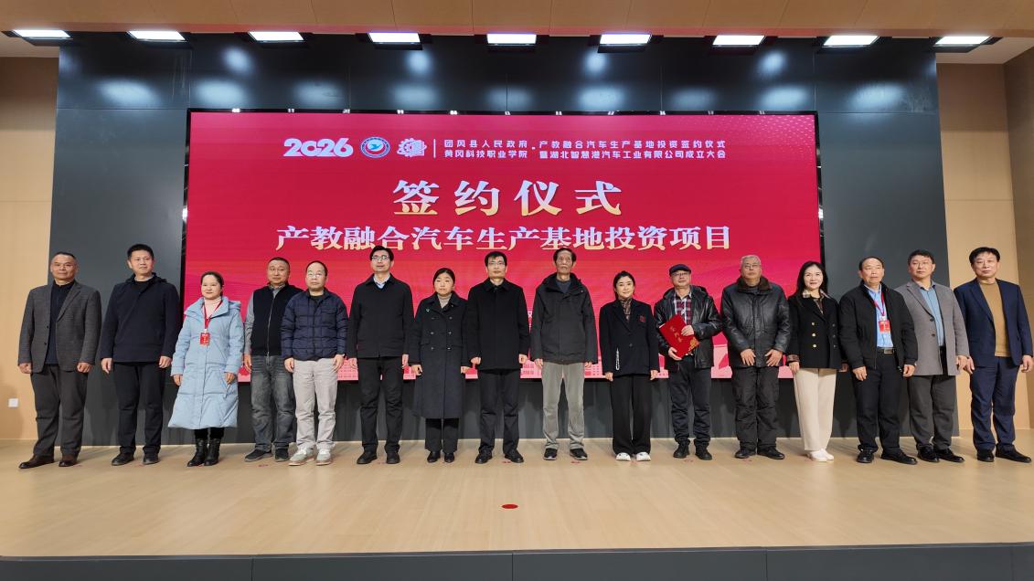 1月26日,团风县人民政府、黄冈科技职业学院与相关企业共建的产教融合汽车生产基地投资签约仪式在黄冈科技职业学院何家湖校区举行。会上同步宣布成立由该校牵头的湖北智慧港汽车工业有限公司正式运营。该基地作为黄冈市首个政校企共建的汽车产业实体化产教融合运营平台,标志着在深化产教融合、促进校企协同发展迈出关键一步,将为区域汽车产业升级注入新动力。
