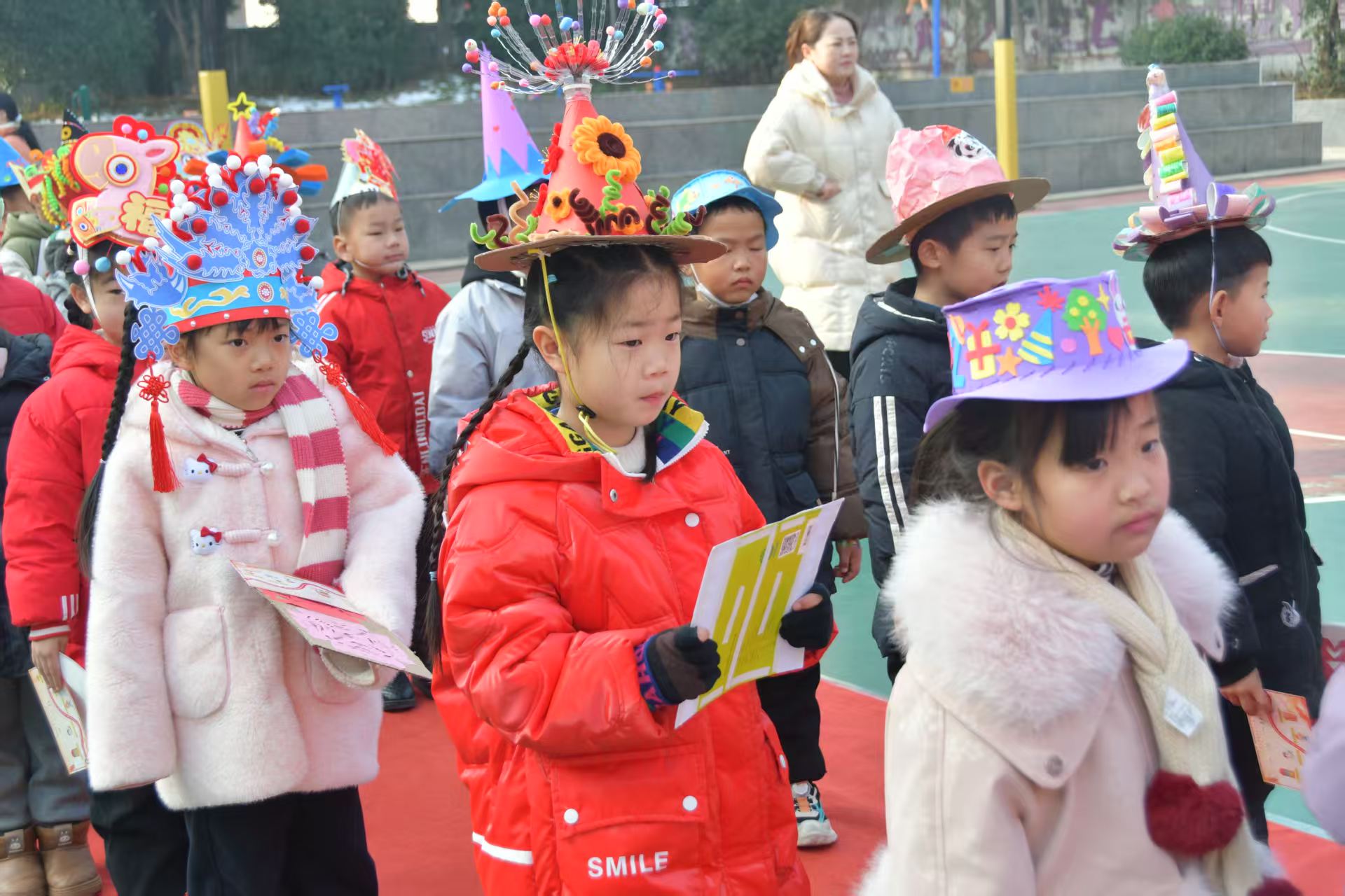 新年礼帽戴起来,创意走秀亮风采!宝贝们戴着在家精心制作的礼帽,自信满满走上 “T 台”。摆 pose、迈大步,每个小身影都超有范儿。走秀结束后,大家还把亲手剪的团花贴在骏马造型展板上,叽叽喳喳分享设计思路。“我的礼帽用了红色和金色,像新年的烟花!”动手能力和审美力双双在线!