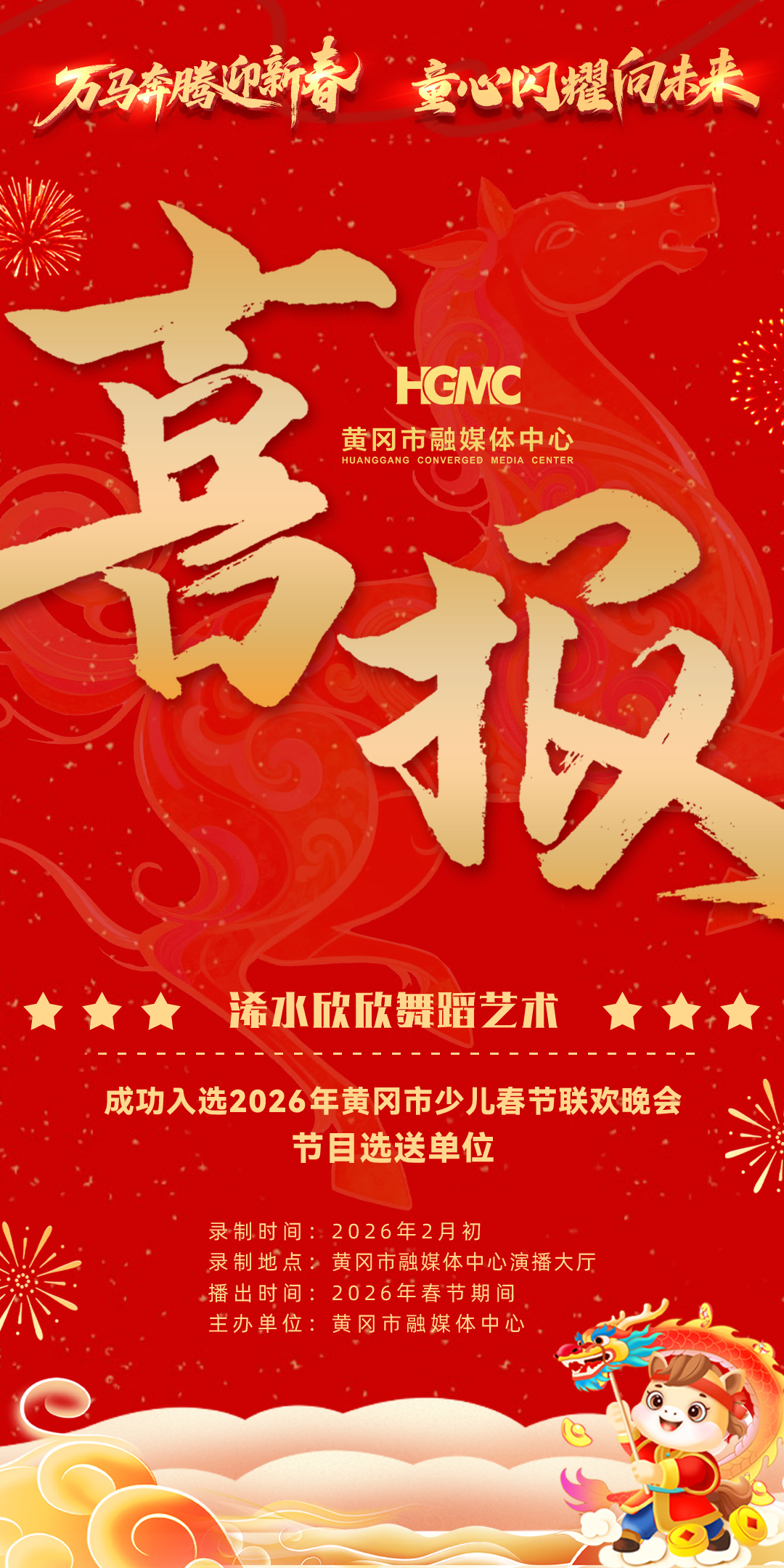 在 2026 年马年新春即将到来之际,由黄冈市融媒体中心倾力打造的 “万马奔腾迎新春,童心闪耀向未来”2026年黄冈市少儿春节联欢晚会,将成为黄冈全市少年儿童展示自我、逐梦绽放的盛大舞台。作为黄冈本土最具影响力的少儿文艺品牌活动之一,本届晚会延续了往届高水准、高口碑的制作传统,以 “童心” 为内核,以 “未来” 为方向,通过丰富多彩的艺术形式,全方位展现黄冈少年儿童积极向上、朝气蓬勃的精神风貌,为全市观众送上一份充满童真与活力的新春祝福。