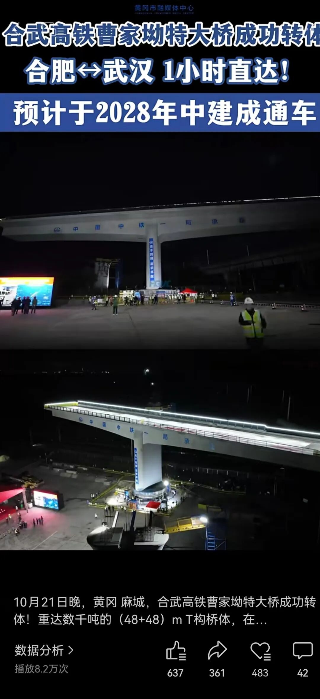 ▲黄冈麻城,合武高铁曹家坳特大桥成功转体!历时67分钟实现毫米级对接!