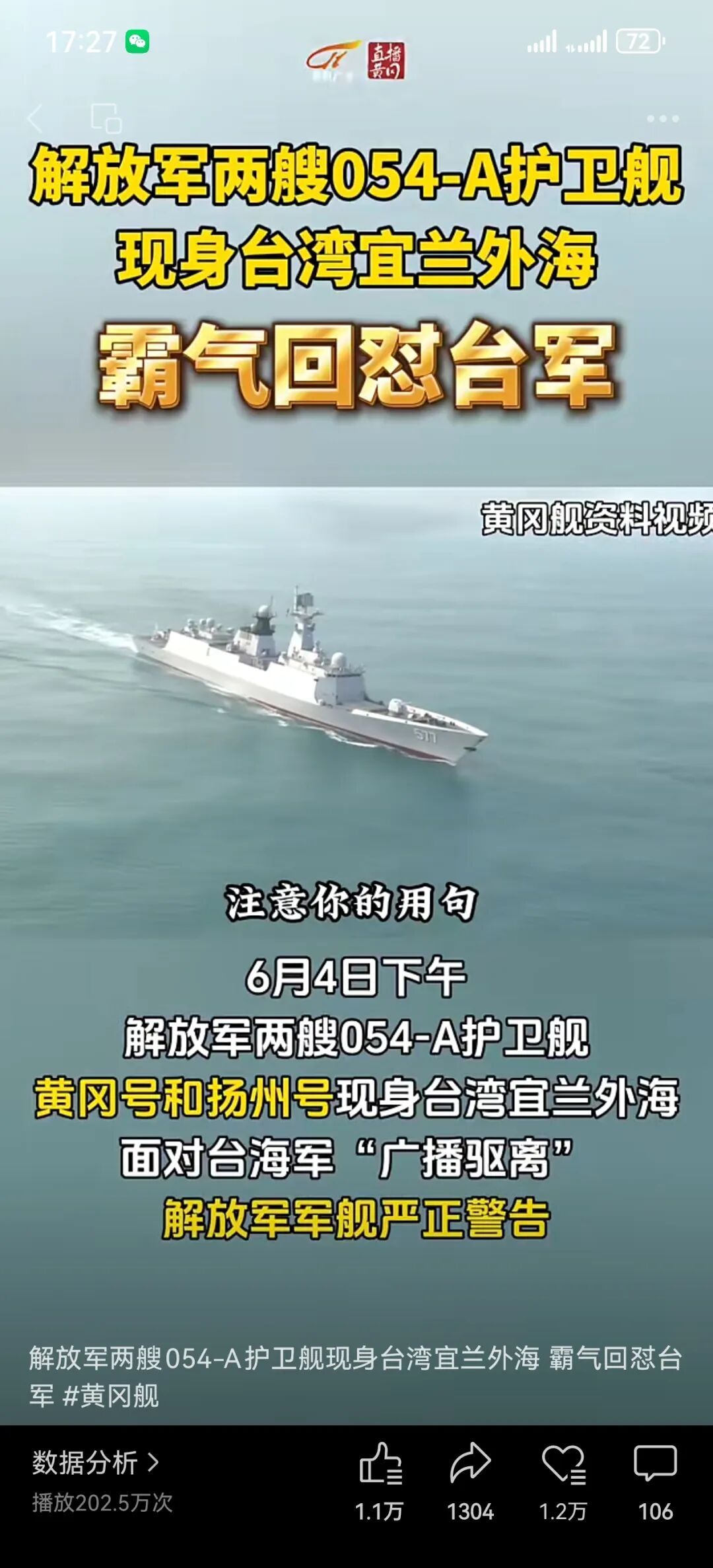 ▲解放军两艘054-A护卫舰黄冈号和扬州号现身台湾宜兰外海面对台海军"广播驱离"解放军军舰严正警告,“24海里邻接区不存在”。