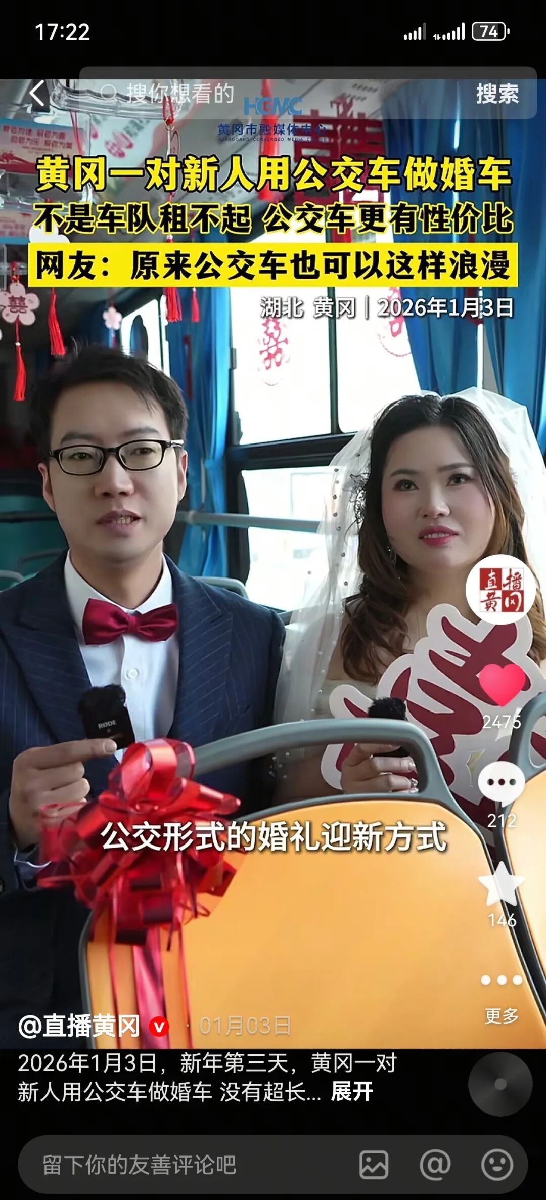 ▲黄冈一对新人用公交车做婚车,没有超长车队,没有奢侈排场,只有一整车的欢声笑语和祝福!