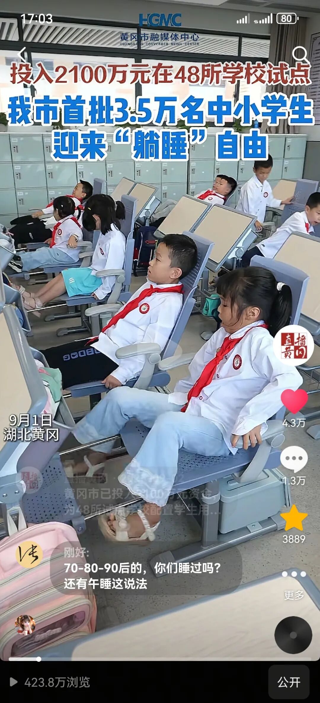 ▲投入2100万元在48所学校试点,黄冈首批3.5万名中小学生迎来"躺睡"自由。
