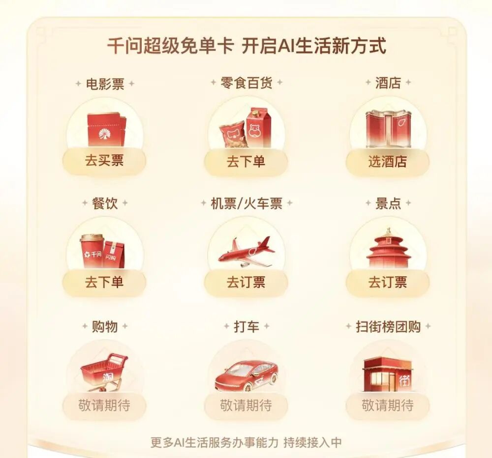 淘宝,闪购,支付宝,盒马,飞猪,大麦……这张覆盖“衣食住行娱”的服务网络,AI可以随时调用,让千问真正做到“会办事”“能履约”。