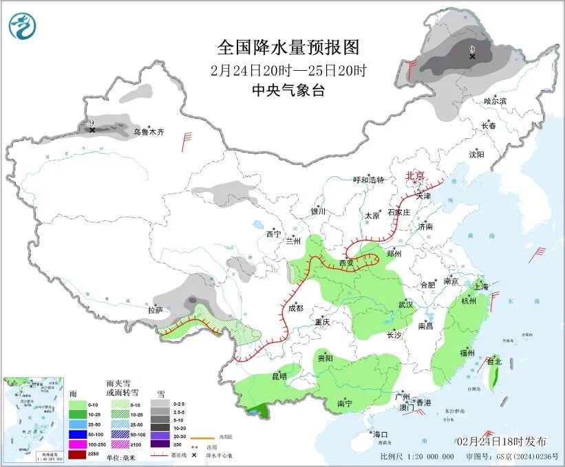 中央气象台预计,25日至27日以及28日至3月2日,黄淮及其以南将先后有两次大范围降水过程,其中贵州中东部、湖南、湖北东部和南部、江西、苏皖中南部、浙江西部、广西北部、广东、福建等地的部分地区有中到大雨,局地暴雨。