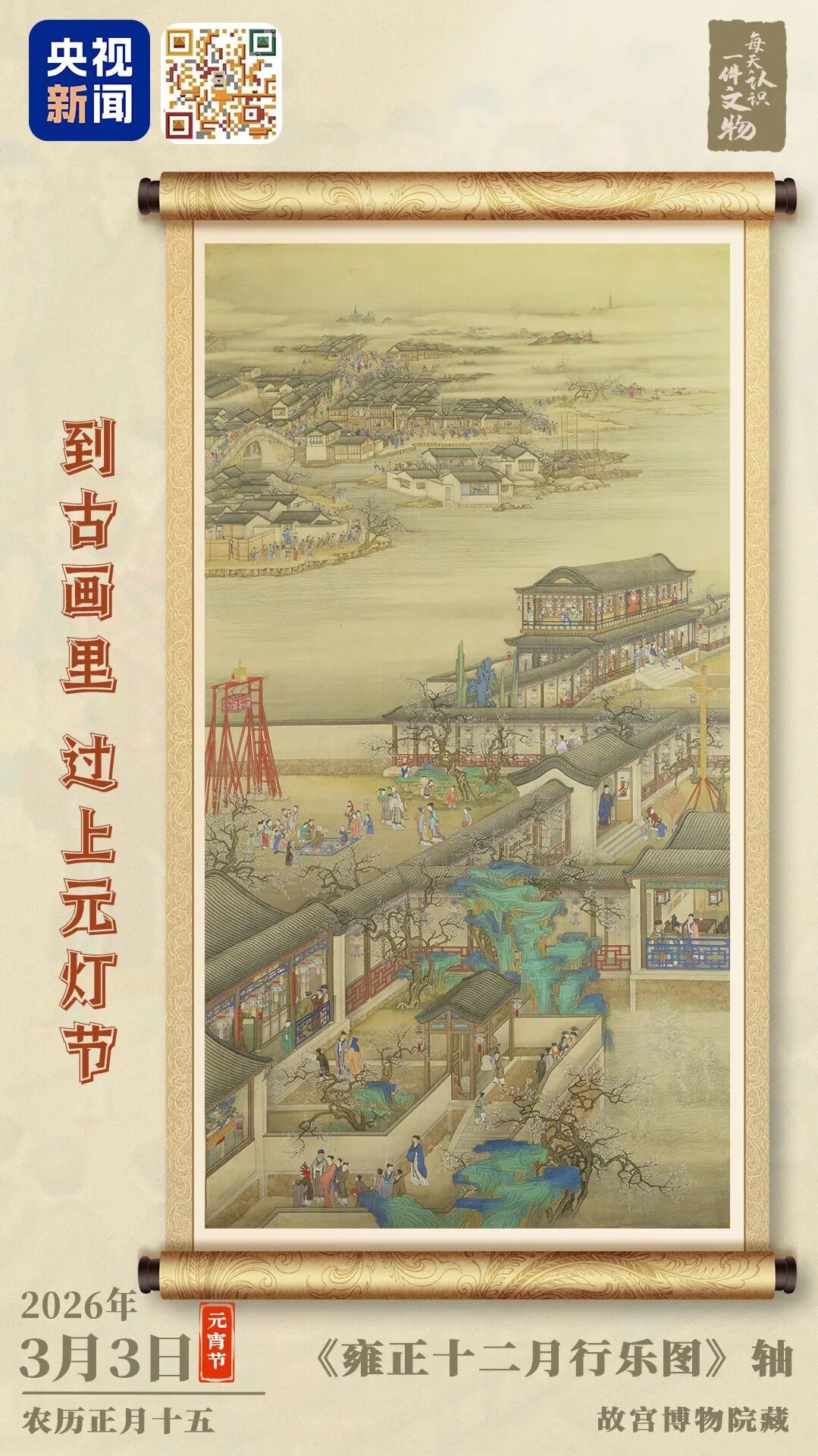 古人如何过元宵?跟着这幅《雍正十二月行乐图》轴,走进三百年前的圆明园,赴一场灯会。一条河从画面中流过,此岸是宫廷的雅集赏灯,山石园林,楼阁巍峨;彼岸是市井的热闹民俗,长桥卧波,人家错落。宫廷的雍容与民间的繁华隔水相望,又同框共生。长按识别图中二维码,查看详情↓