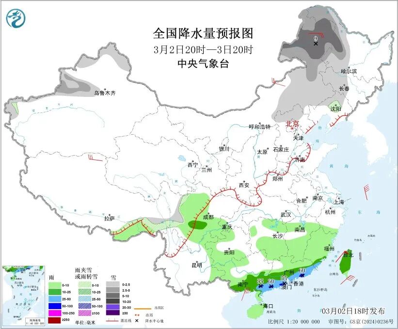 中央气象台预计,2日20时至3日20时,新疆北部、西藏东南部、内蒙古东部、东北地区西部、华北北部等地部分地区有小到中雪或雨夹雪,其中,内蒙古东北部、黑龙江西部等地部分地区有大雪;西藏东南部、川西高原、重庆西部、云南东部、贵州西部、江南中南部、华南南部有小到中雨,其中福建东南部、广东南部、广西东南部等地部分地区有大雨,局地暴雨。