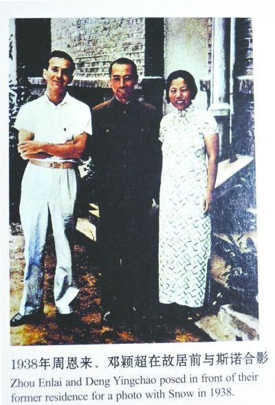 周恩来、邓颖超在珞珈山旧居前与斯诺合影。 资料图片