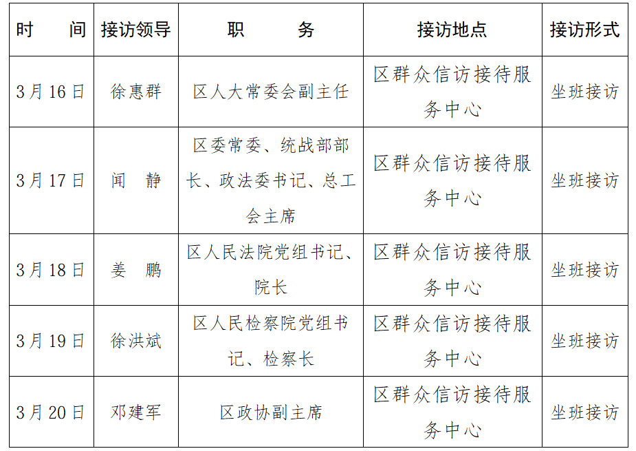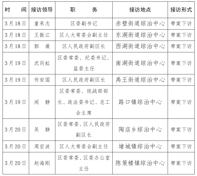 为深入践行党的群众路线,加强和改进人民信访工作,进一步畅通信访渠道,依法及时就地解决群众合理诉求,根据工作安排,多元化开展领导坐班接访和带案下访,现就三月份第三周黄州区领导接访安排公示如下:
