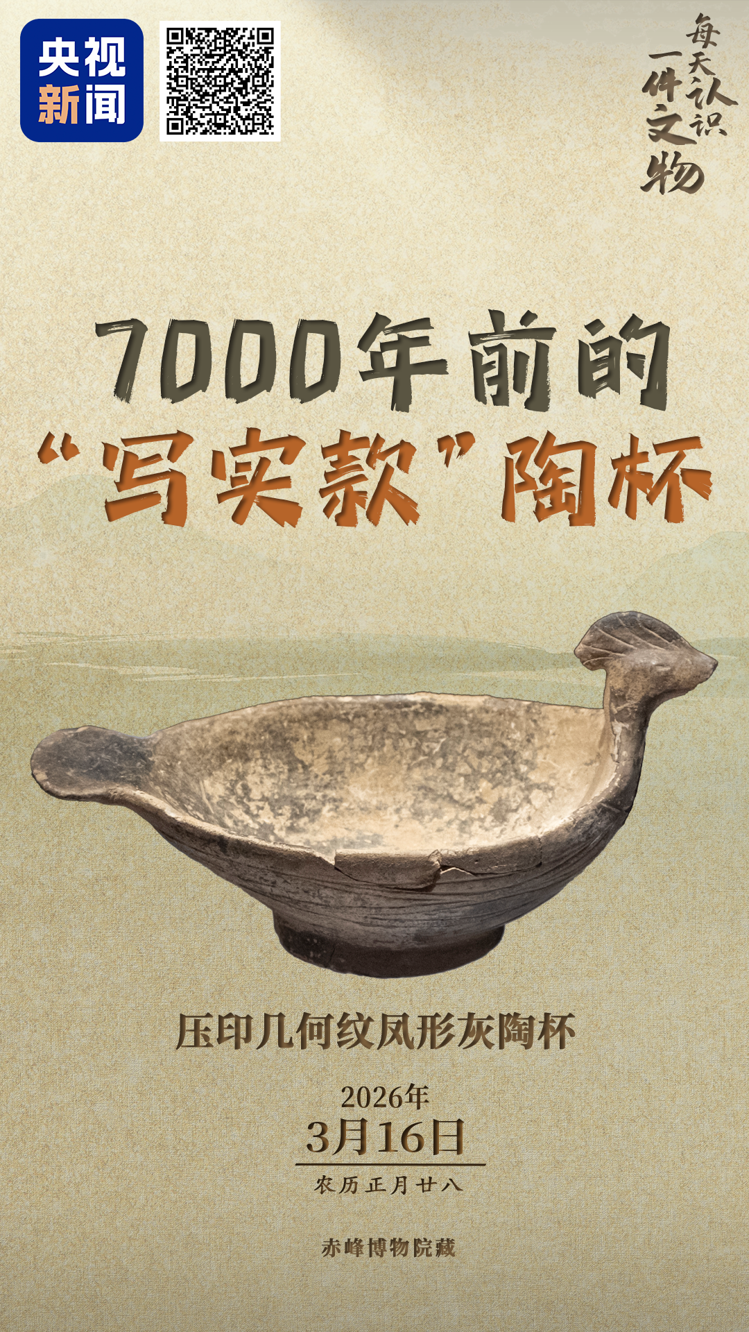 央视新闻联合全国博物馆推出文博科普产品《文博日历》,每天带你认识一件文物。压印几何纹凤形灰陶杯,距今约7000年,陶杯被塑造成了一只神态悠然、引颈长鸣的凤鸟,器身上装饰交叉的几何线纹、细线纹恰如其分地刻画出羽翼的层次感。头、冠、翅和尾的造型极为写实,是我国有关“凤”较早的实物资料。长按识别图中二维码,查看详情↓