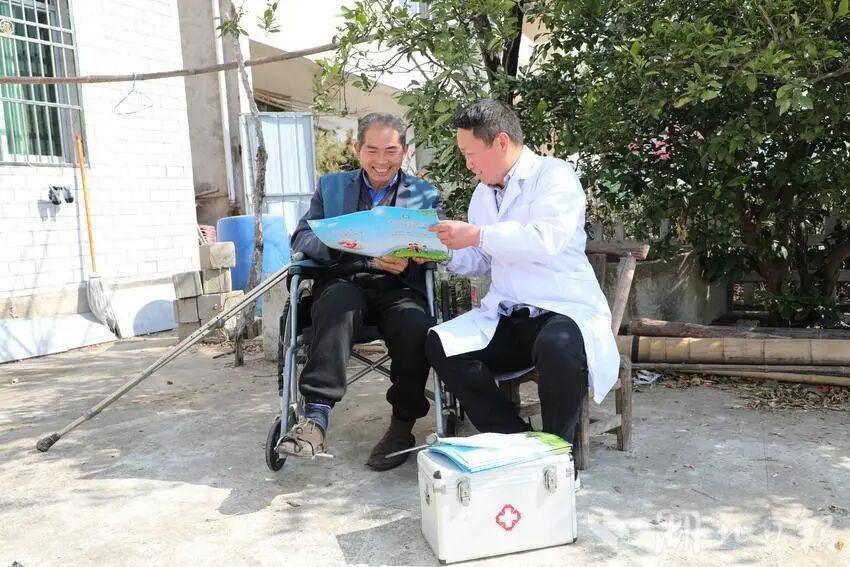 3月12日,英山县杨柳湾镇英山尖村十组,65岁脱贫户徐莲朋家门口,村医徐宇轩蹲下身,轻托老人春节前骨折的右足仔细查看,恢复情况良好。量血压、询问用药、更新健康档案、完成公共卫生签约服务,一套流程有条不紊,耗时20余分钟。