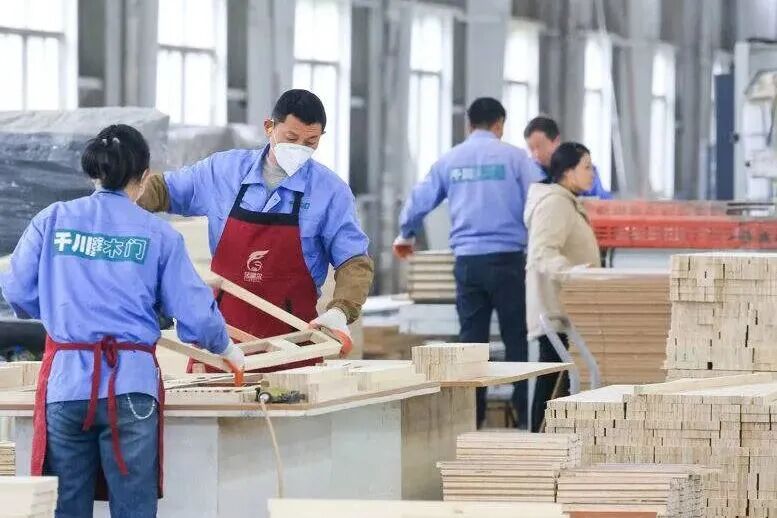 图为千川木门的工人正在加工产品