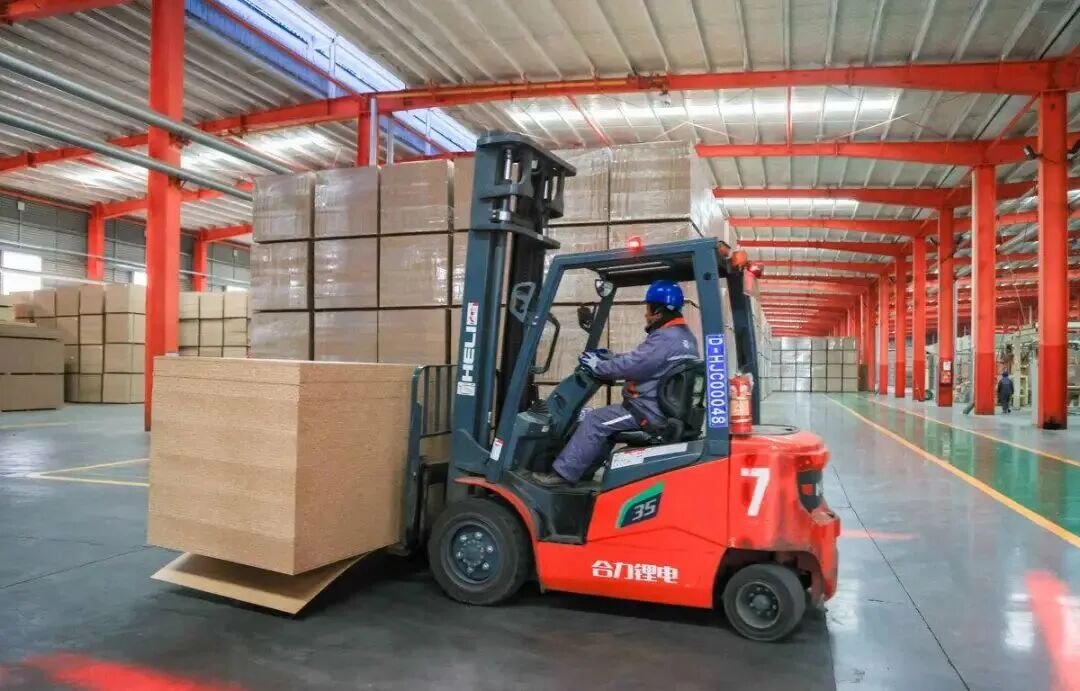 图为宁丰板材车间,工人正在操作叉车