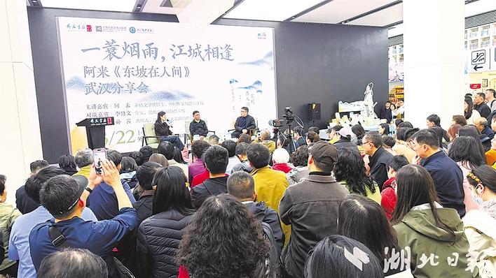 3月22日,“一蓑烟雨,江城相逢——阿来《东坡在人间》分享会”在湖北省外文书店举行。茅盾文学奖得主、中国作家协会副主席阿来携长篇非虚构新作《东坡在人间》到场,与作家、湖北省作家协会主席李修文展开对谈,为读者们讲述丰满而生动的“人间东坡”。 (湖北日报全媒记者 喻煜 实习生 别小彤 余鑫 摄)